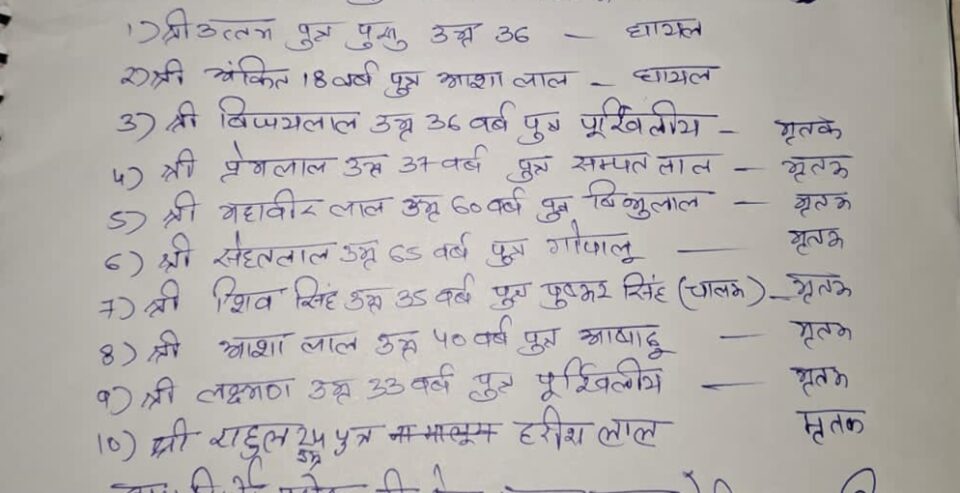 दुर्घटना में मृतकों के पोस्टमार्टम की कार्यवाही गतिमान है तथा परिजनों को सूचित कर दिया गया है।